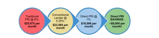 If you look at mortgage financing with a twenty-year amortization (term could be 10Y with balloon), fixed-rate traditional PRI interest at 6% requires $25,075 per month in payments (interest and principal). If a PRI could be structured with a 1% fixed rate (direct to the borrower), payments drop to $16,096. That is a direct savings of $9K per month or 36%. Conventional market debt would save $1.5K, in The Common Market’s model, $9K per month cash savings would support: